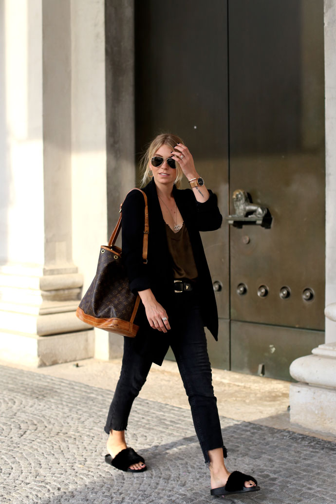 Vergangene Woche war wieder ein solch besagter Tag und deswegen habe ich mich für eine lockere Jeans in einem verschwaschenen grau Ton, meine Louis und ein oliv farbenes Satin Top von Anna & Ella (shop it here) entschieden. Dazu wurde dann noch ein schwarzer Blazer und meine neuen Sandalen (die übrigens auch von Anna & Ella sind, shop it here) kombiniert. Obwohl das Outfit doch recht einfach gehalten ist, wollte ich es euch dennoch nicht vorenthalten und et voilá…!
